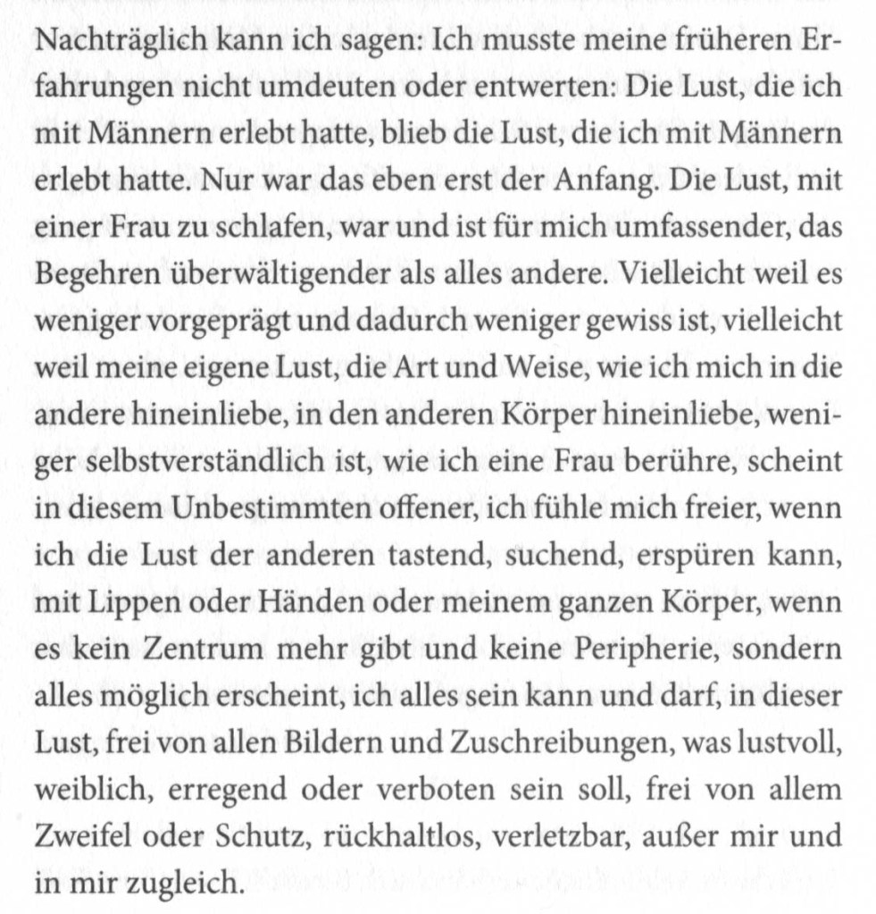Einige Seiten weiter lese ich bei Emcke, nachdem sie „das erste Mal“, „das zweite, das dritte Mal“ mit einer Frau geschlafen habe:
